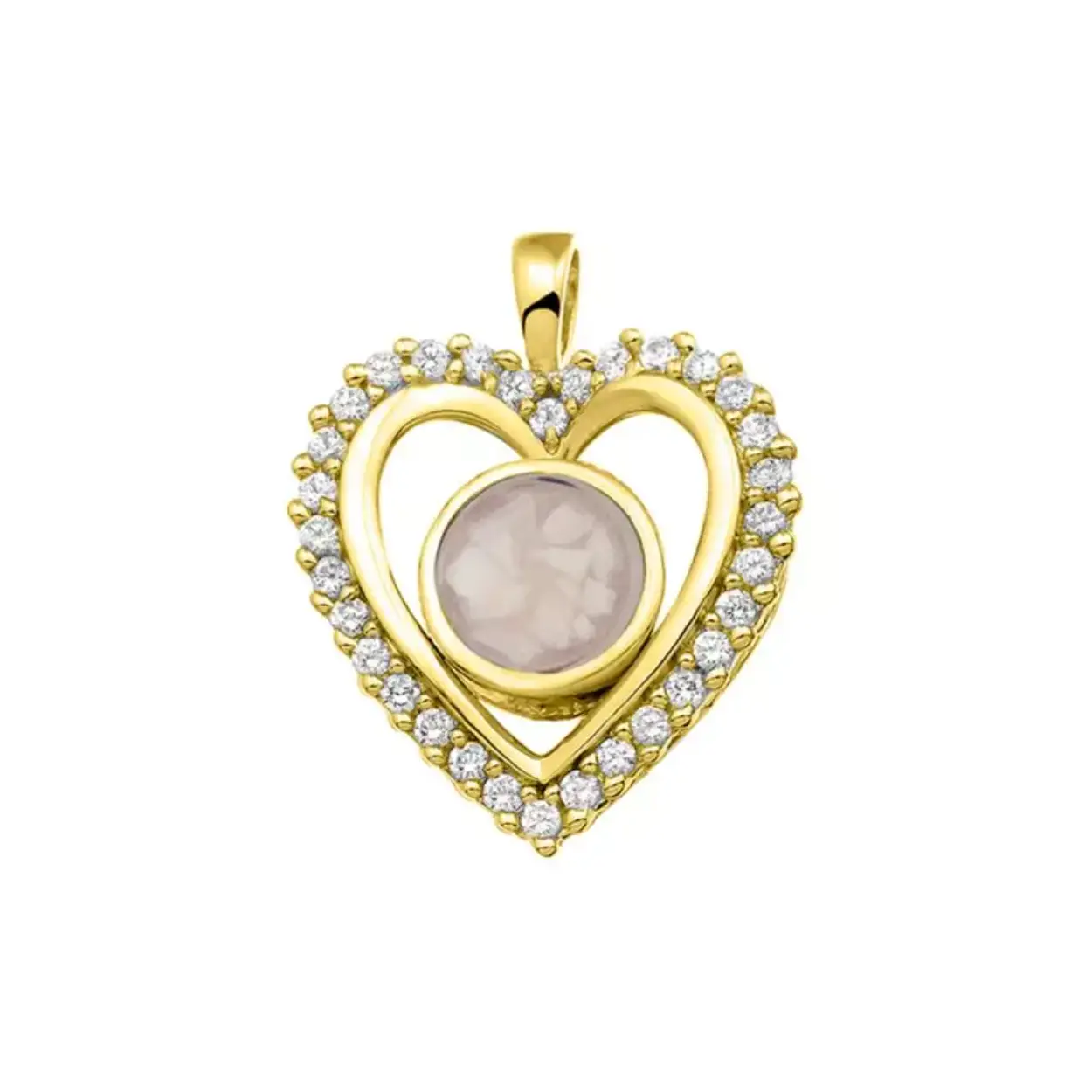 Zilveren hart hanger gezet met zirkonia’s. Dit sieraad wordt zichtbaar aan de voorkant gevuld met as of haar en wordt vermengd met onze speciale hars. U kunt helaas dit niet zelf vullen.