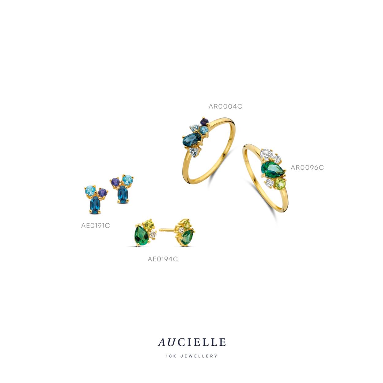 Aucielle oorstekers goud 18k, groene topaas, peridot, amethist