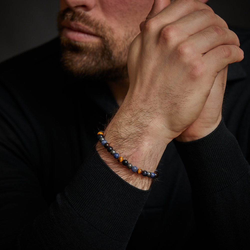 Armband van het merk Rebel & Rose. De armband heeft een hoogwaardige elastische stretch koord, met 6mm van Sodaliet, geelbruine Tijgeroog, blauwe Tijgeroog, grijze Hematiet.