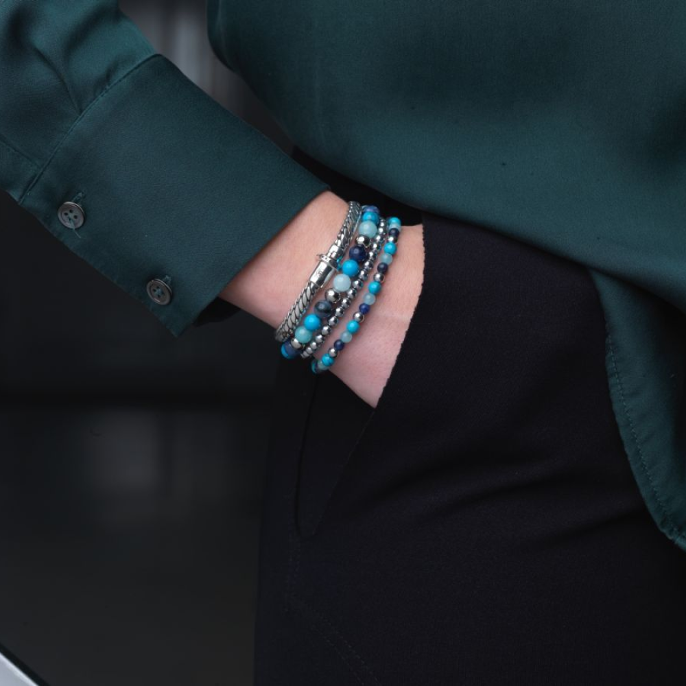 Armband van het merk Rebel & Rose. De armband heeft een hoogwaardige elastische stretch koord, met 6mm van Sodaliet, Art. Turquoise, Jade.