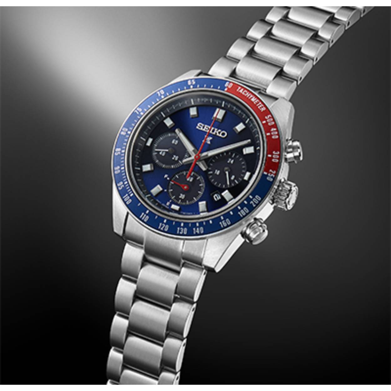 Seiko Prospex Speedtimer solar chronograaf blauwe wijzerplaat.Deze solar chronograaf horloges erft de iconische ontwerpen en stijlen van de Speedtimer serie uit de jaren 60-70.