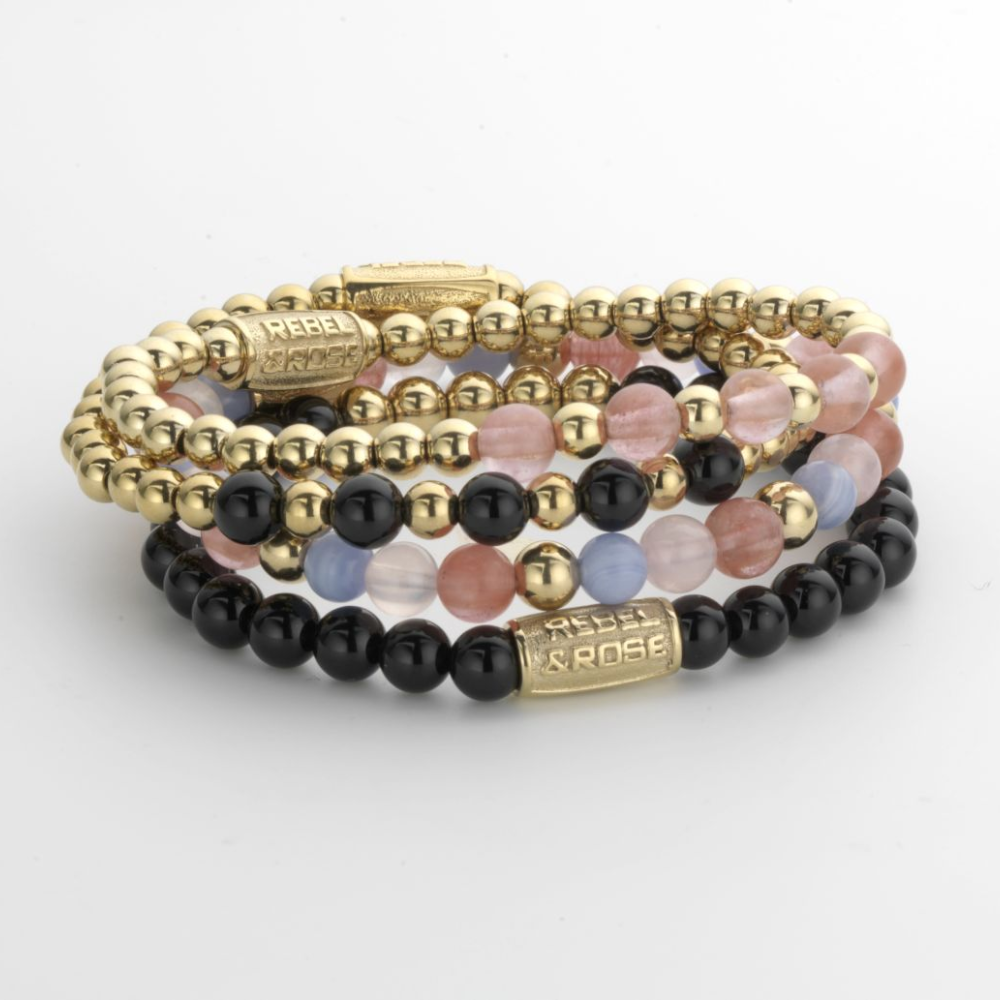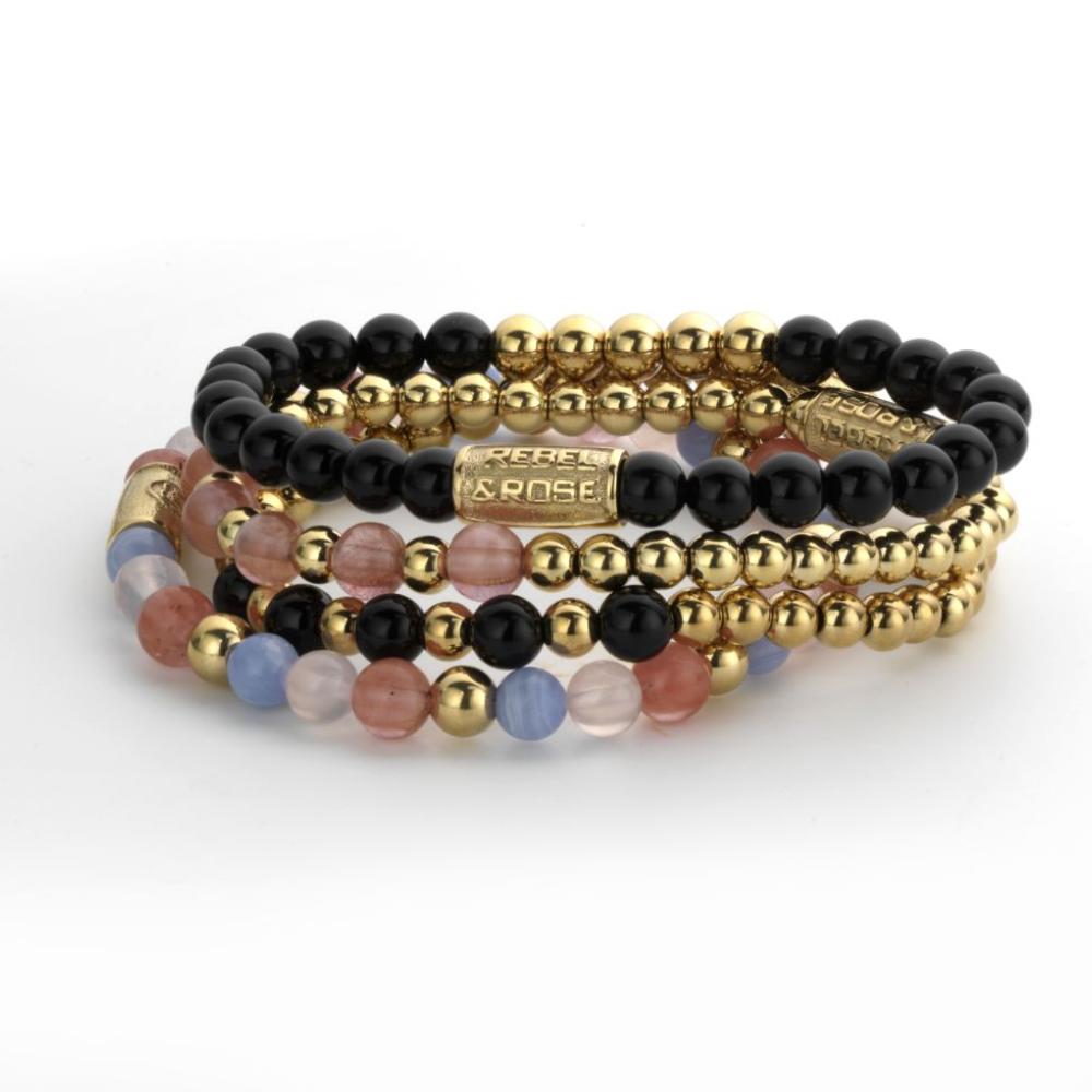 Armband van het merk Rebel & Rose. De armband heeft een hoogwaardige elastische stretch koord, met 6mm van RVS ion-gold plated, Agaat zwart.